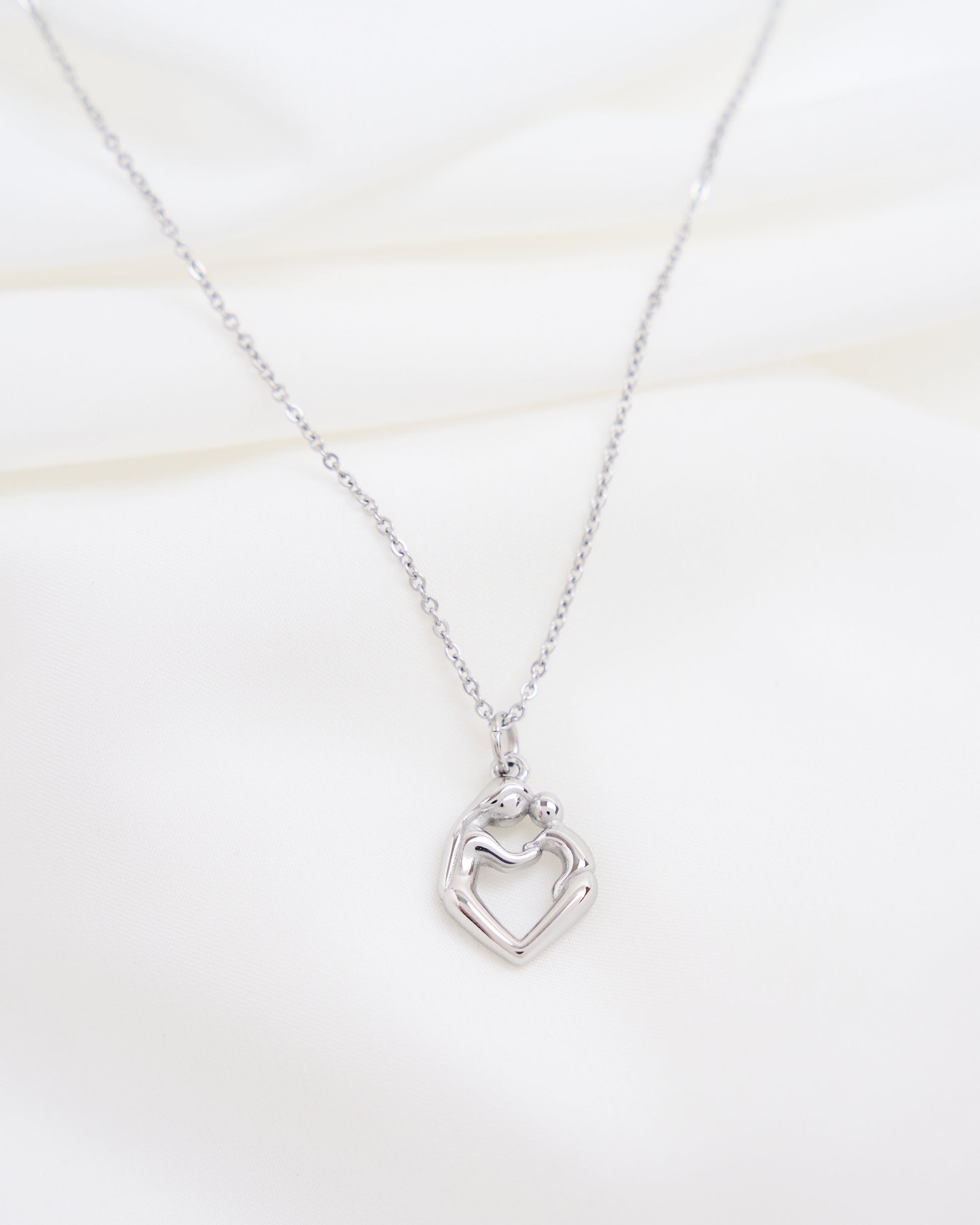 The pendant features two figures gently embracing to form a delicate heart shape, representing the closeness, protection, and love that defines motherhood. Elegant and meaningful, this piece was designed to celebrate the special moments and connections that shape our lives.